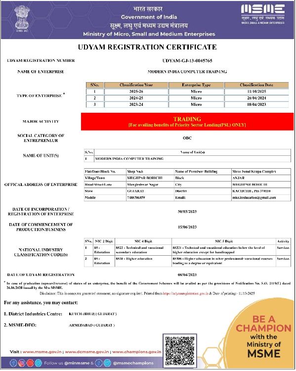 NAME OF ENTERPRISE : MODERN INDIA COMPUTER TRAINING