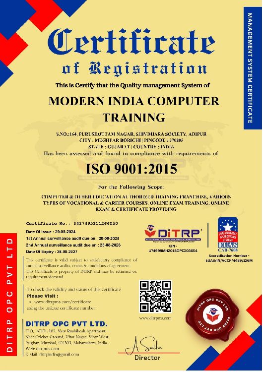 This is Certify that the Quality management System of MODERN INDIA COMPUTER TRAINING has been assessed and found in compliance with requirements of 9001:2015 .